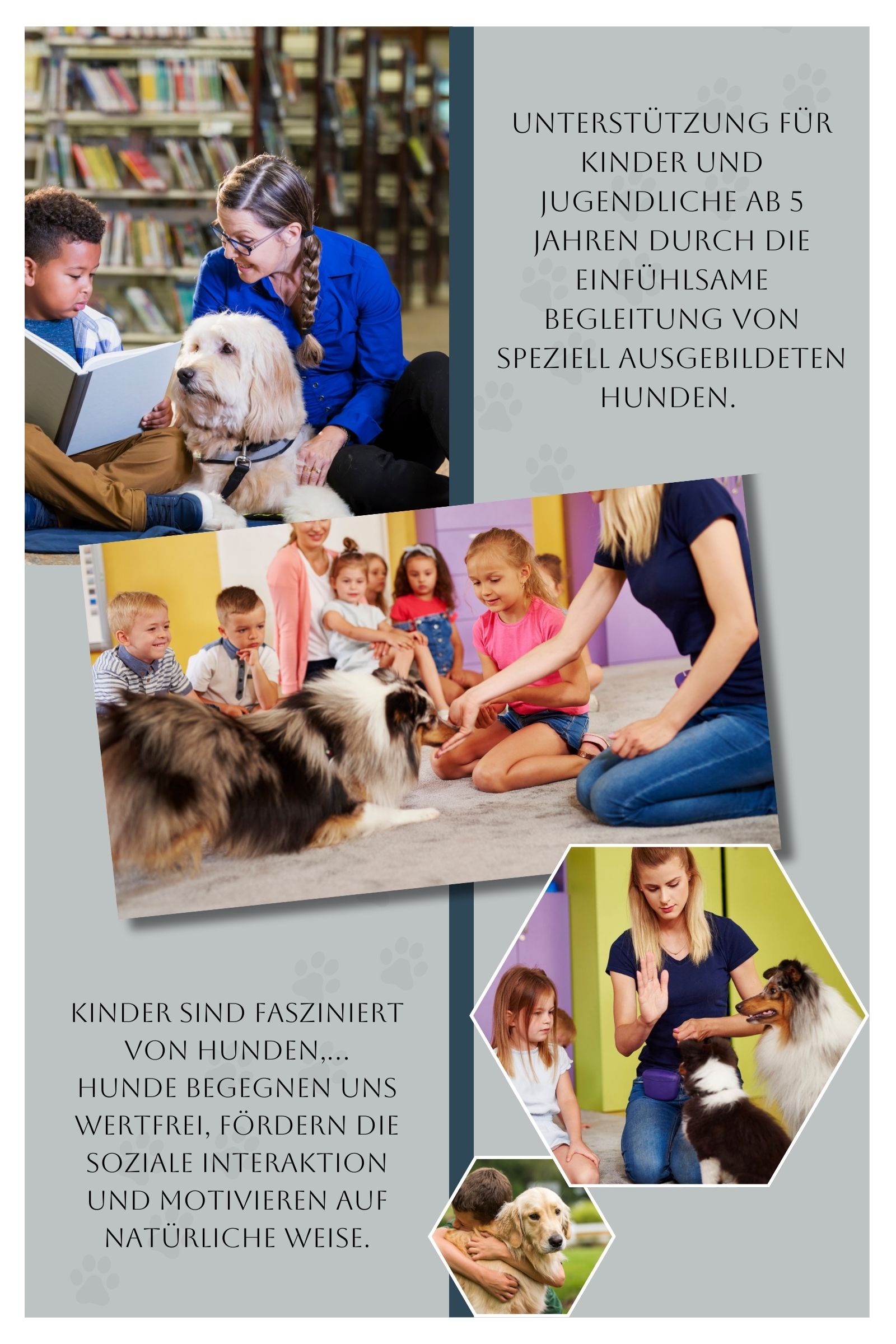 Tiere übernehmen in pädagogischen Kontexten oft die Rolle eines „sozialen Katalysators“ und fördern den Zugang zu Lern- und Entwicklungsprozessen. Sie stärken soziale Kompetenzen, unterstützen emotionale Entwicklungen und tragen zur Verbesserung des Lernklimas bei. Der gezielte Einsatz von Hunden in unserer Einrichtung steht bei uns dabei im Vordergrund.